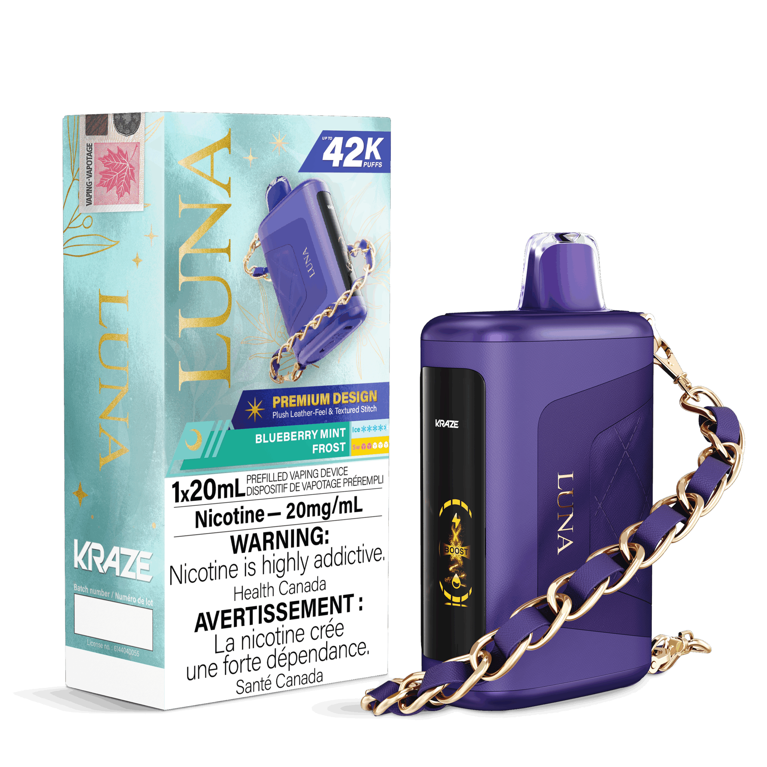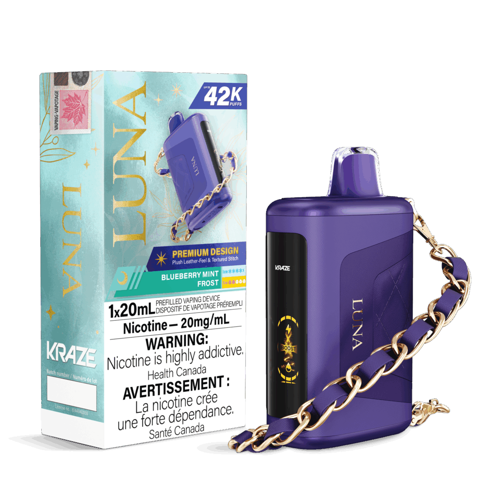 Enhance your vaping experience with the Kraze Luna Disposable Vape – Blueberry Mint Frost edition – a device that perfectly blends style, performance, and innovation. Designed for vapers who value both elegance and functionality, the Kraze Luna delivers an impressive 42,000-puff capacity, making it one of the longest-lasting disposable vapes on the market. This isn’t just a vape—it’s a statement piece. Featuring a 0.96-inch HD screen display, plush leather-feel finish with textured stitching, and an attachable stylish bracelet, it’s perfect for vaping in sophisticated, fashionable style.
