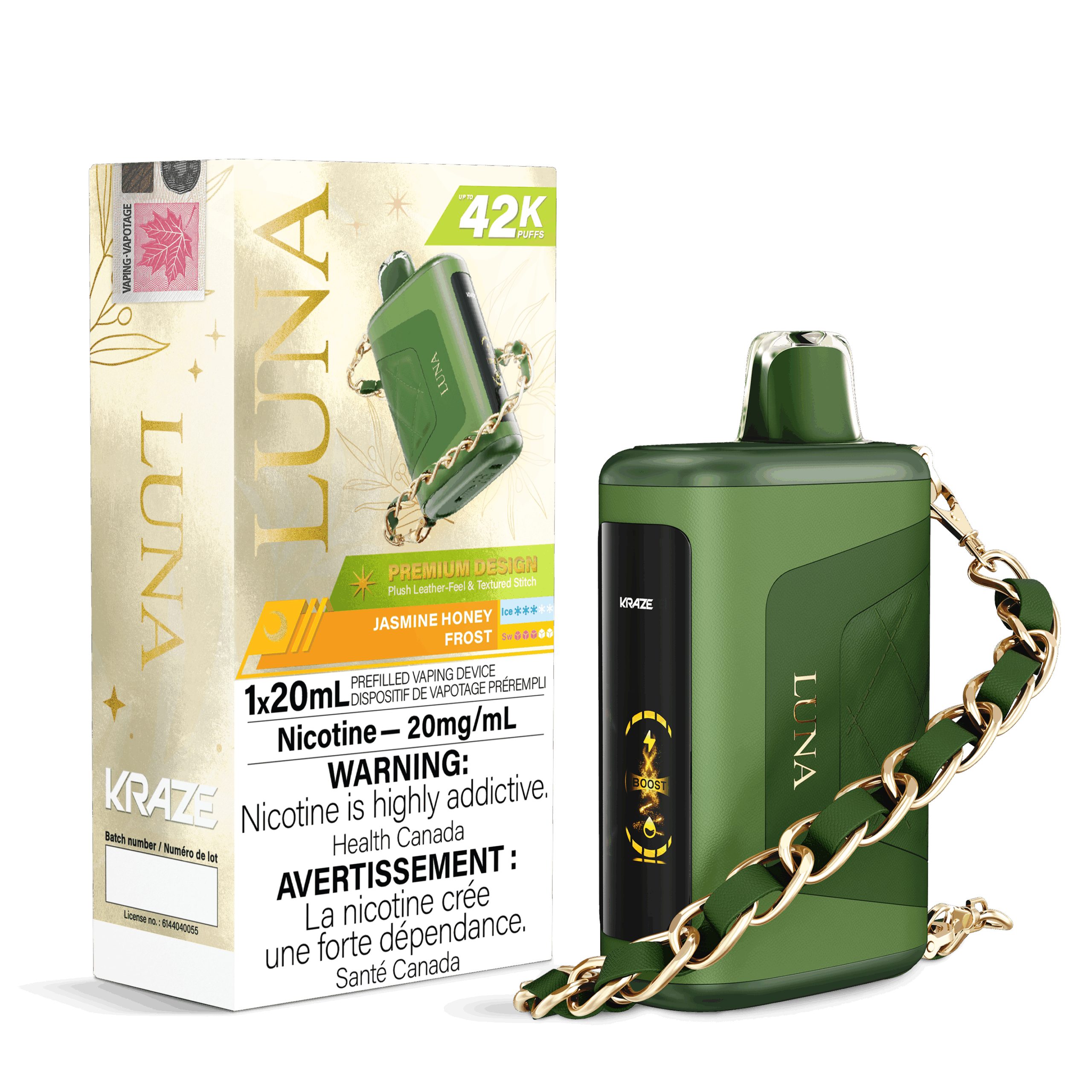 Elevate your vaping with the Kraze Luna Disposable Vape – Jasmine Honey Frost edition – a device that perfectly combines elegance, performance, and innovation. Designed for vapers who appreciate both style and substance, the Kraze Luna offers an impressive 42,000-puff capacity, making it one of the longest-lasting disposable vapes on the market. This isn’t just a vape—it’s a statement piece. Featuring a 0.96-inch HD screen display, plush leather-feel finish with textured stitching, and an attachable stylish bracelet, it’s ideal for those who enjoy vaping in fashion-forward style.