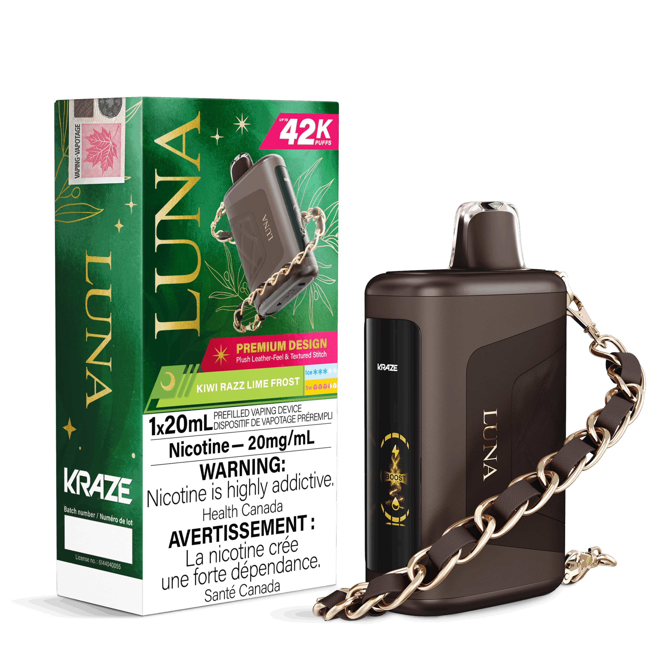 Step up your vaping game with the Kraze Luna Disposable Vape – Kiwi Razz Lime Frost edition – a device that merges elegance, performance, and innovation. Designed for vapers who crave both style and substance, the Kraze Luna delivers an impressive 42,000-puff capacity, making it one of the longest-lasting disposable vapes available. This isn’t just a vape—it’s a statement piece. Featuring a sleek 0.96-inch HD screen display, plush leather-feel finish with textured stitching, and an attachable stylish bracelet, it’s perfect for those who love vaping in fashion-forward style.