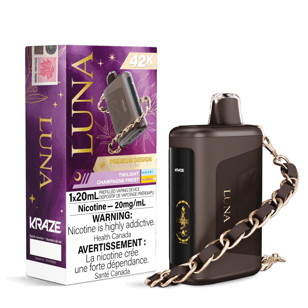 Twilight Champagne Frost Kraze Luna Disposable Vape: A smooth grape blend greets the palate first, followed by elegant notes and a refined, chilled finish for a sophisticated and refreshing vaping experience.