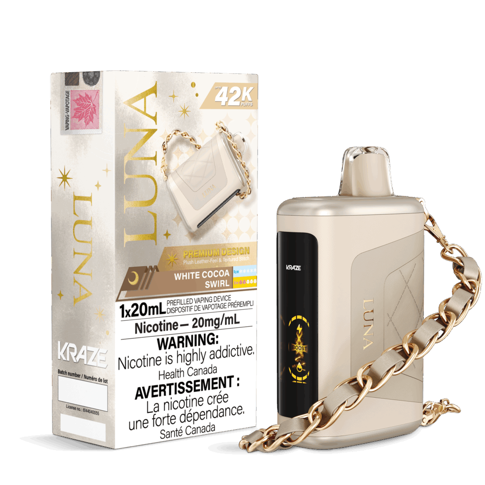 White Cocoa Swirl Kraze Luna Disposable Vape: A velvety smooth white cocoa blend swirls elegantly with a subtle hint of refined texture, delivering a sophisticated and indulgent vaping experience.